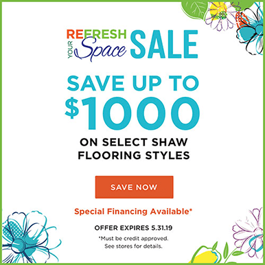 Manufacturer consumer rebate for qualifying product purchases (see store for complete details) from Anderson Tuftex, COREtec and Shaw Floors of $2/sq. yd. ($0.22/square foot) on soft surface and/or $0.22/sq. ft. on hard surface, up to $500. Rebate is valid for purchases during promotion period: October 3 – November 17, 2025. Rebate subject to change or cancellation in whole or in part without notice. Rebate cannot be combined with any other manufacturer’s offer. No duplicate requests accepted. Rebate subject to product availability. All rebate claims may be audited, and unsubstantiated claims may be denied. Fraudulent submissions of multiple requests could result in prosecution. Void where taxed, prohibited or restricted by law. Requests from P.O. Boxes will not be honored. Manufacturers, distributors, retailers, and their employees and families may not participate. Shaw is not responsible for illegible, late, lost, or misdirected mail. Limit one rebate entry/form per household. This rebate is good for qualifying purchases from a Shaw Flooring Network participating retailer. Actual rebate form will be provided by the participating retailer with instructions needed to claim rebate on ShawRebate.com/SFN/Fall/. Rebates must be claimed by November 17, 2026 Valid in U.S.A. and Canada only. Keep copies of documentation for your records. Visit ShawRebate.com/SFN/Spring/ for details. Special financing may be available at participating retailers, pending credit approval on purchase.